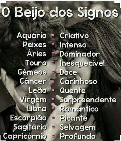 – Libra (23/09 a 22/10): equilíbrio é o regente dos librianos, sendo assim, seus beijos são mais contidos. Estilo do beijo: charmoso, delicado e com estilo;